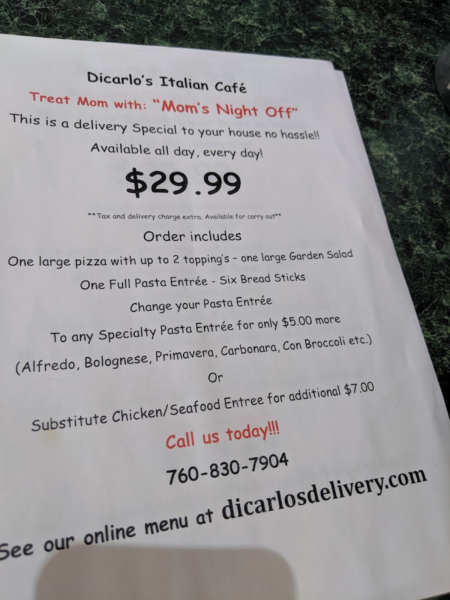 Located in the heart of Twentynine Palms, DiCarlo's Italian Cafe stands as a delightful culinary retreat that captures the essence of traditional Italian cuisine with a unique twist. As soon as you step inside, you are enveloped in a warm and inviting atmosphere, infused with the lively spirit of Italian charm complemented by a hint of Marine flair. It’s a perfect blend that makes dining here not just a meal, but a memorable experience.